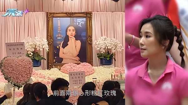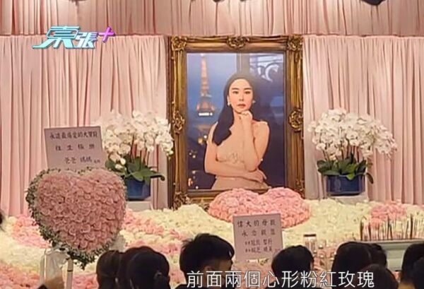 只见灵堂左右两侧摆满白色兰花,前面两个心形粉红玫瑰,由蔡天凤母亲及婆婆致意。