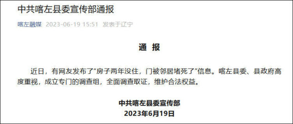 据微信公众号“喀左融媒”6月19日消息,中共喀左县委宣传部发布《通报》称,近日,有网友发布了“房子两年没住,门被邻居堵死了”信息。喀左县委、县政府高度重视,成立专门的调查组,全面调查取证,维护合法权益。