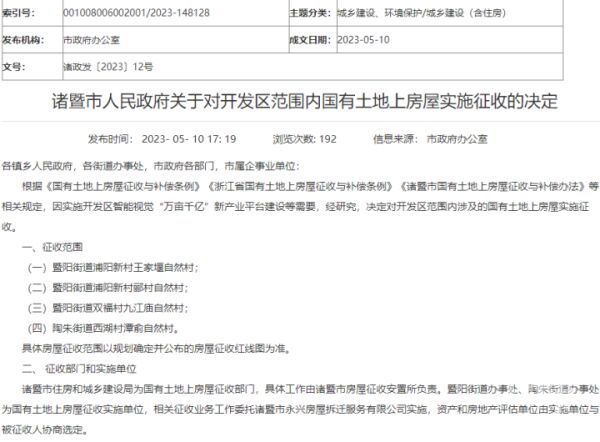据橙柿互动记者了解,今年5月10日,为了实施开发区智能视觉“万亩千亿”新产业平台建设等需要,诸暨市人民政府对外发布了关于对开发区范围内国有土地上房屋实施征收的决定,其中就包括浦阳新村王家堰自然村。