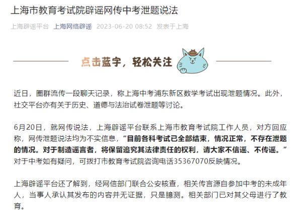 经网信部门联合公安核查,相关传言源自参加中考的未成年人,当事人承认其发布的内容并无证据,只是臆测。相关部门已对其父母进行了教育。