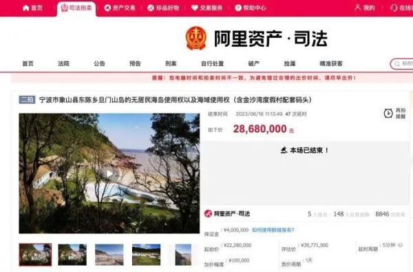 几天后,宁波市中级人民法院发布了二拍公告。这次旦门山岛的起拍价降到了2228万元,竞价周期仍为一天,四家竞拍投资人经过了55轮出价,最终B6915号投资人竞拍成功,成交价2868万元低于评估价1000万多元。