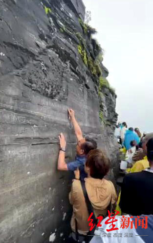 6月18日,有游客在梵净山金顶岩壁刻字(网传视频截图)