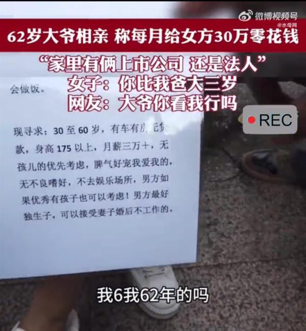 不过,女子手中的相亲信息牌上也写着,现寻求:30至60岁,有房有车无贷款,身高175cm以上,月薪三万多,无孩的优先考虑,无不良嗜好,不去娱乐场所,可以接受妻子婚后不工作的。