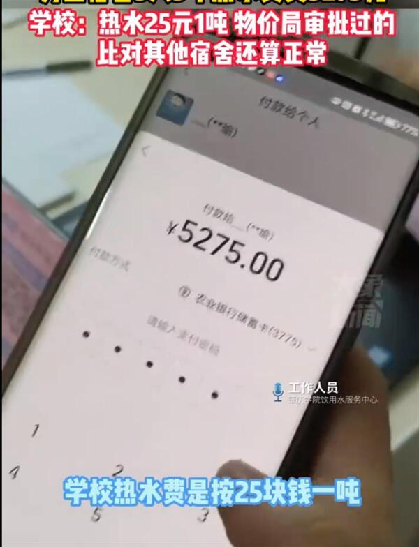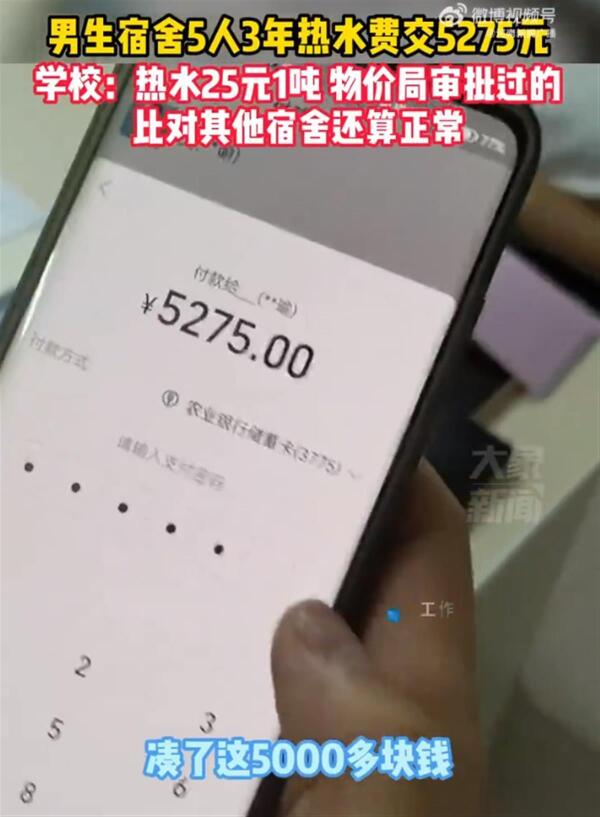 6月20日,学校饮用水服务中心工作人员称,热水供学生洗澡用,外包给公司管理的,一吨25元是物价局审批过的。5个人近3年用5000多可能是由于个人习惯不同,对比其他宿舍还算正常。