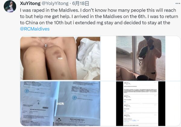 该游客18日发推并晒图,自曝在马尔代夫旅游期间被性侵