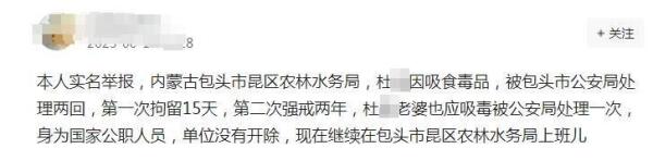 6月19日,有网友在网络举报称,内蒙古包头市昆都仑区农牧局公职人员杜某,曾因吸食毒品被包头市公安局处理两回,“第一次拘留15天,第二次强戒两年”,但是却没有被所在单位开除,仍在继续上班。