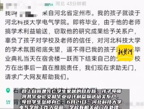 据华商传媒集团“二三里资讯”报道,6月21日,网传河北科技大学一学生身亡,其家属发文质疑“老师学术不端导致孩子身亡”。