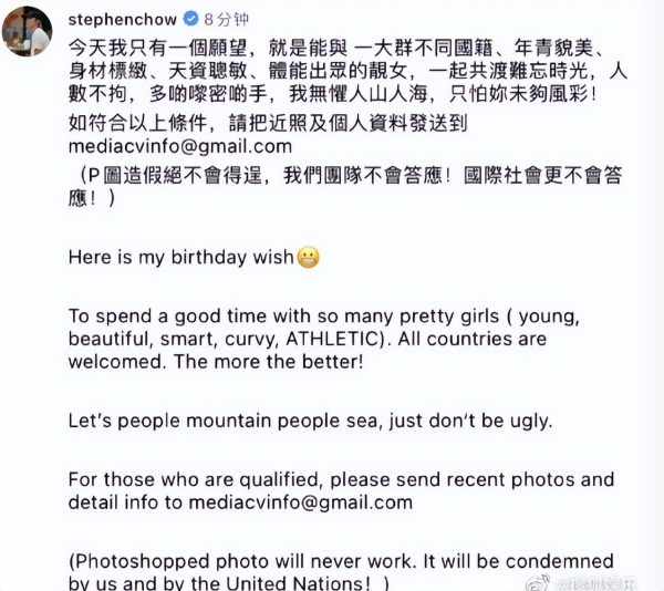 最近,周星驰突然更新动态,为新项目《少林女足》面向全球招募女演员,而且正好当天是他的生日,他写道:“今天我只有一个愿望,就是能与一大群不同国籍、年轻貌美、身材标致、天资聪敏、体能出众的靓女,一起共渡难忘时光......我无惧人山人海,只怕你未够风彩! ” 从发布的视频中,能看到剧本初稿已有。