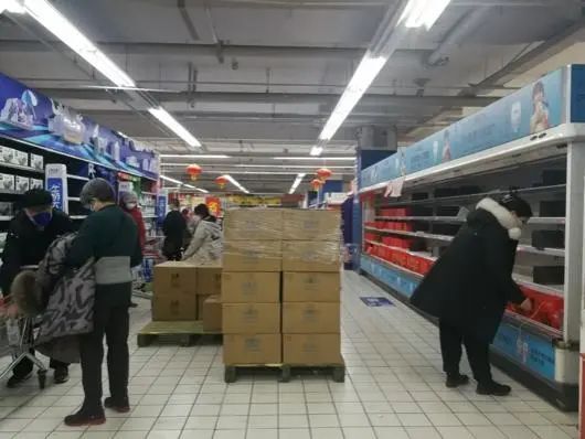 大部分冷藏食品区已空置。在奶制品区域,低温奶区完全空置,常温奶区域也有部分货架空置。