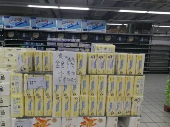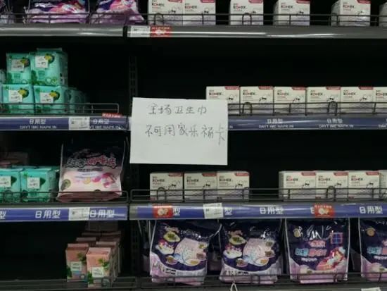 为防止发生购物卡挤兑、产品快速售罄,家乐福卖场内大部分种类的物品都写着“不可用购物卡”的告示。摄影/马霖