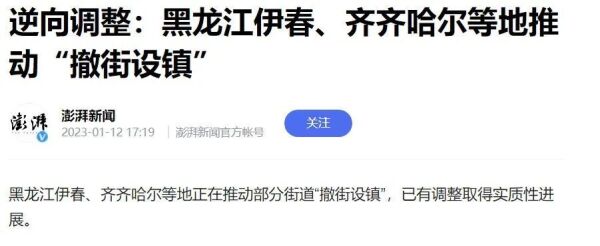 2023年1月12日,黑龙江伊春、齐齐哈尔等地正在推动部分街道“撤街设镇”,已有调整取得实质性进展。