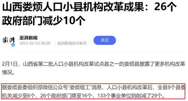 今年2月初,山西娄烦人口小县也公布了其机构改革成果: