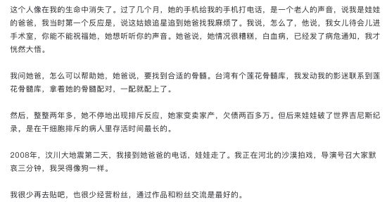 但遗憾的是,之后的两年多,娃娃不停地出现排斥反应,最终还是离开了,“2008年,汶川大地震第二天,我接到她爸爸的电话,娃娃走了。我正在河北的沙漠拍戏,导演号召大家默哀三分钟,我哭得像狗一样。我很少再去贴吧,也很少经营粉丝,通过作品和粉丝交流是最好的。”
