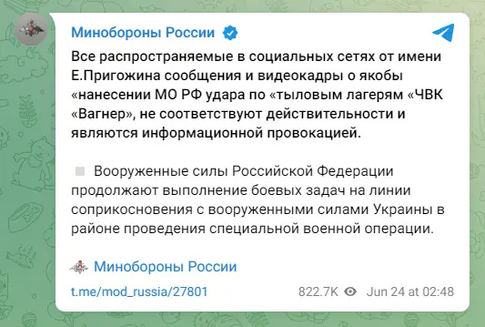 对此,俄罗斯国防部发布声明称,在社交网络上以普里戈任名义传播的所有关于 “俄罗斯国防部对‘瓦格纳私人军事公司后方营地’进行打击 ”的消息和视频都是不真实的,是一种信息挑衅。俄国防部强调俄罗斯联邦武装力量继续在特别军事行动地区与乌克兰武装部队的接触线上执行战斗任务。