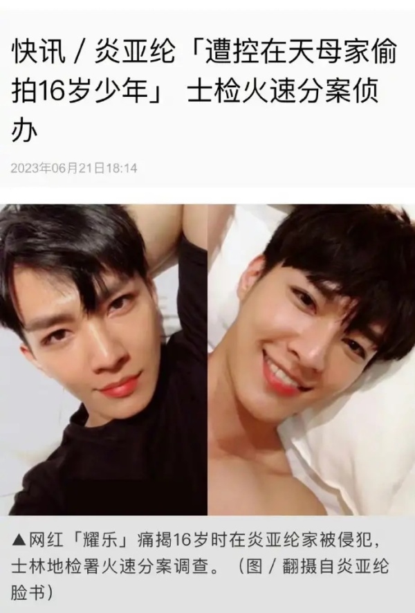 6月21日,炎亚纶现身邱耀乐记者会,鞠躬向邱耀乐道歉,离场后炎亚纶崩溃痛哭,哭喊称自己没有做任何强迫意愿的事情。此前,炎亚纶承认与未成年男性发生关系,称自己也是受害者,那些私密图频也在折磨自己。