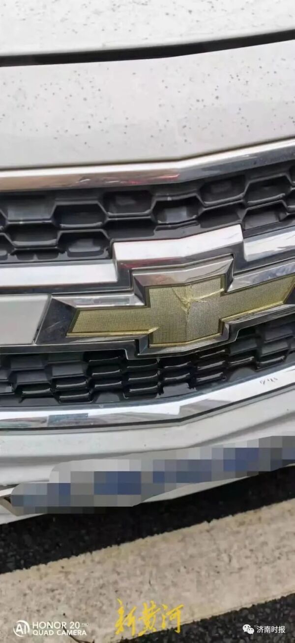 张某撞击妻子的车辆,车标出现裂纹。