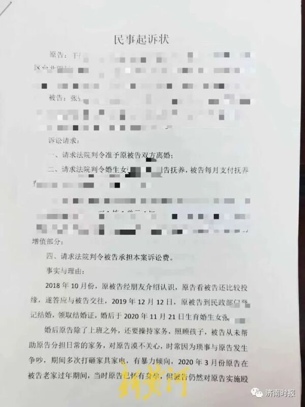 一份印有干某手印的民事起诉状显示,案发四天前,干某请求法院判令准予双方离婚。起诉状中提到,2020年3月,干某与张某留在张某的老家荆州,其间遭到张某家暴。干先生表示,张某不顾女儿有孕在身,在荆州老家打她,女儿报警求助并到医院就诊。