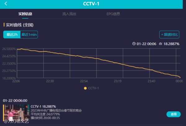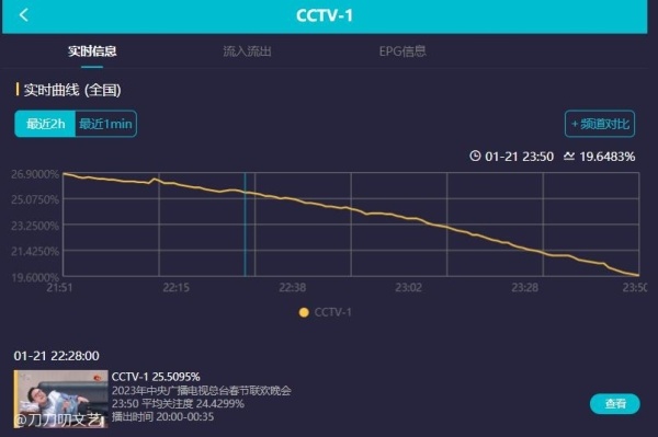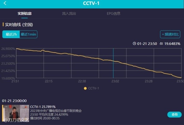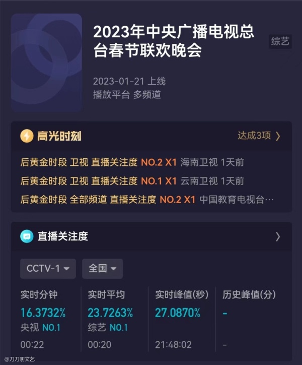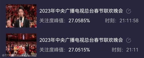 根据酷云实时的收视率数据,兔年春晚实时平均收视率为23.753%,实时收视率峰值为27.087%,而创造了收视峰值的节目正是小品,果真是春晚的铁杆“收视王牌”。