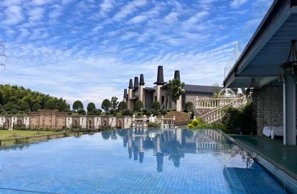猪景房所在地不是普通养猪场,而是一座花园般的“熊猫猪猪乐园”。最大的一座城堡,就是猪舍,被花园和茶园围绕,弥漫着栀子花香。猪舍实行全封闭式管理,闻不到一丝臭味。乐园还特意将咖啡厅、会议大厅都安排在猪舍楼上,游客们可以在浓郁的咖啡香气里,参观小猪从怀孕、哺乳、保育到育肥的养殖全过程。
