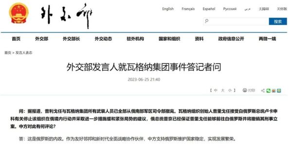 导读:中国外交部回应瓦格纳集团事件:这是俄罗斯的内政。作为友好邻邦和新时代全面战略协作伙伴,中方支持俄罗斯维护国家稳定,实现发展繁荣。