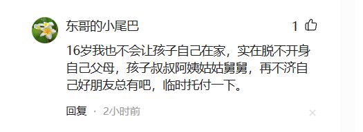 甚至有网友表示,就算是16岁,也不会让孩子自己在家,实在脱不开身自己父母,孩子叔叔阿姨姑姑舅舅,再不济自己好朋友总有吧,临时托付一下。