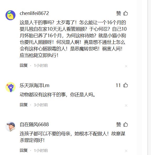 正如下面这位网友所说,就算养只宠物,也该想到需要吃喝才能活吧?独留16个月小孩在家中,出游10天,只能说要么是存心的,要么是有精神疾病。