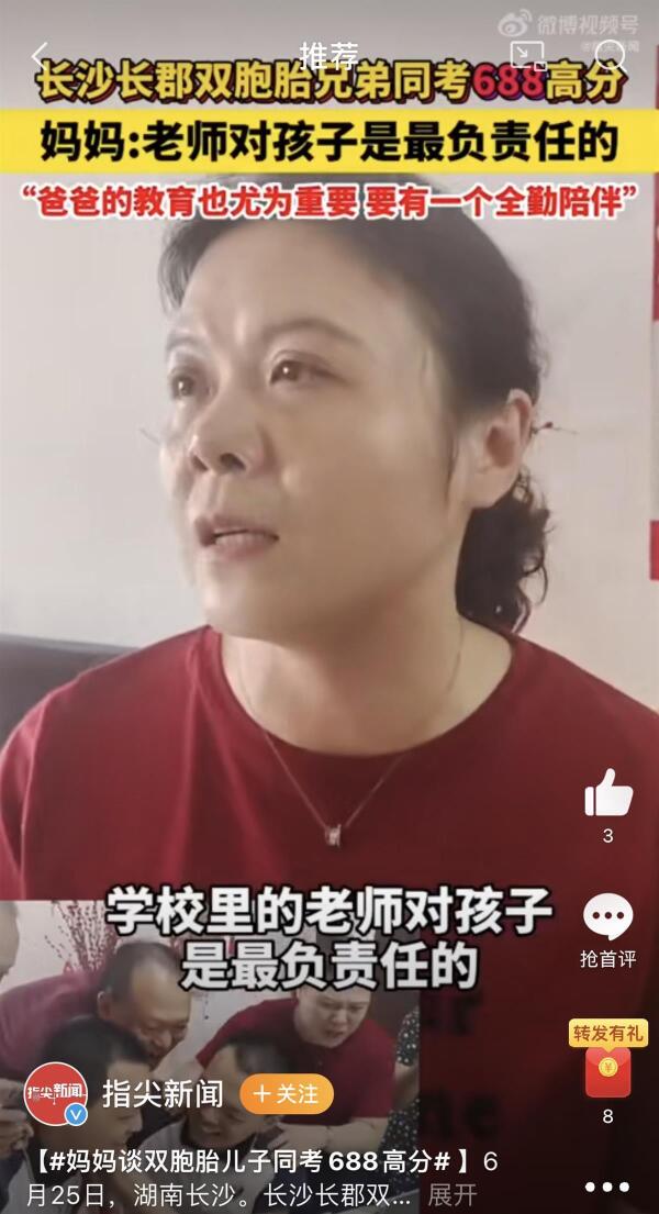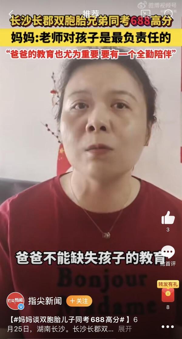 据指尖新闻6月26日报道,6月25日,湖南长沙长郡,双胞胎兄弟同考688高分。