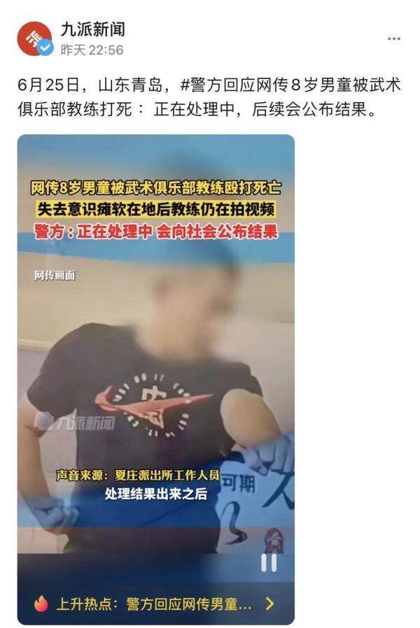 近日,网传一8岁男童被武术教练殴打致死。6月26日,山东省青岛市公安局城阳分局发布一则情况通报。