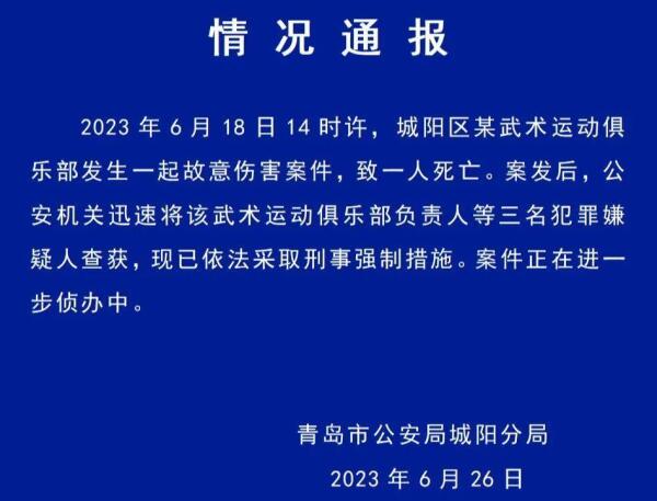 2023年6月18日14 时许,城阳区某武术运动俱乐部发生一起故意伤害案件,致一人死亡。案发后,公安机关迅速将该武术运动俱乐部负责人等三名犯罪嫌疑人查获,现已依法采取刑事强制措施。案件正在进一步侦办中。