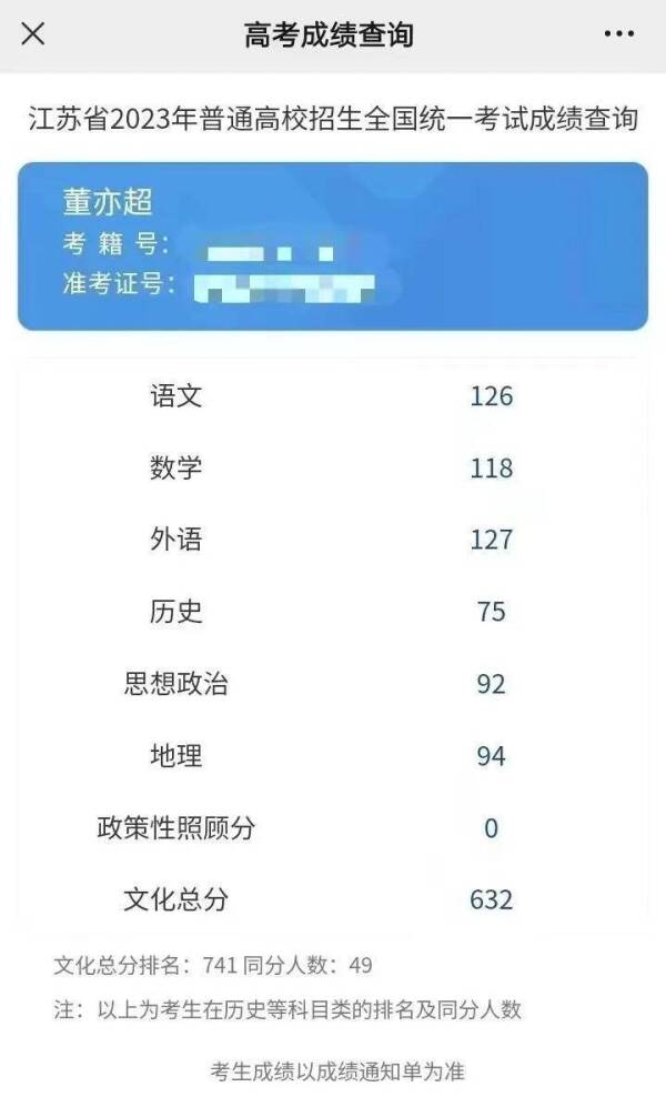 “632分!”24日晚上8点左右,看到成绩的那一刻,顾卫华悬着的心终于落定,6年的相依苦读,这一刻她比儿子更兴奋,“考得不错,挺好的。”其实,她知道,此刻的儿子多少有点失落,因为离董亦超自己预期的分数有一些差距,她还是扭头笑着安慰儿子,鼓励阳光乐观的董亦超露出往日的笑脸。