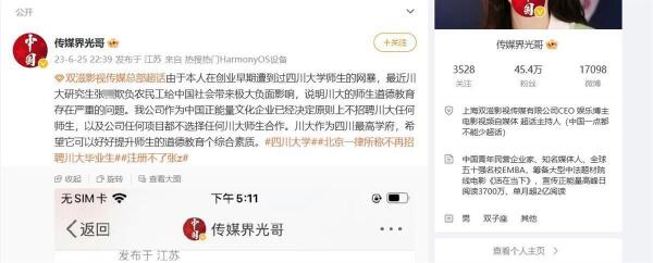 6月25日晚,微博账号“传媒界光哥”发文称,由于其本人在创业早期遭到过四川大学师生的网暴,最近川大研究生张某欺负农民工一事也给社会带来极大负面影响。其公司作为中国正能量文化企业,已经决定原则上不招聘川大任何师生,公司任何项目都不选择任何川大师生合作。