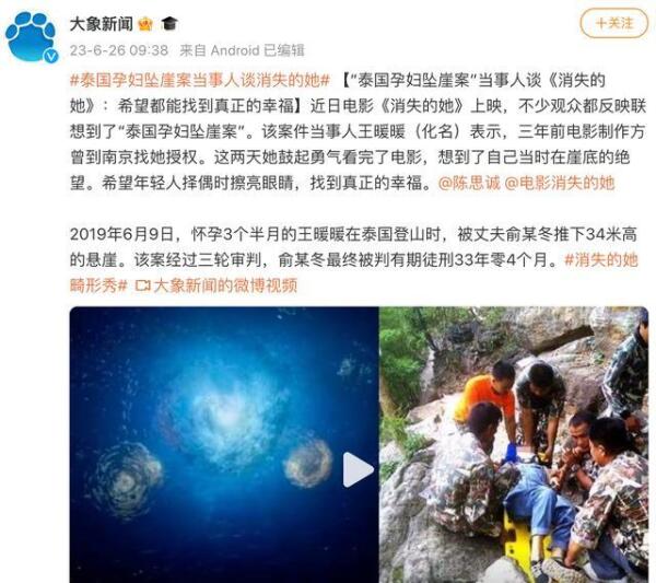 电影《消失的她》的上映,再次让人们看到了人性中的黑暗面。这部电影的故事情节与“泰国孕妇坠崖案”有着惊人的相似之处,让不少观众不寒而栗。而案件当事人王暖暖(化名)也看到了这部电影,并回忆起了自己当时的绝望心情。