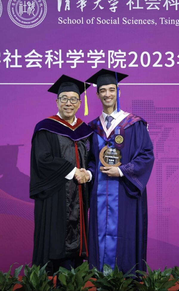 韦紫明身穿硕士服十分帅气有型,和清华大学彭凯平教授握手合影,笑容阳光自信。