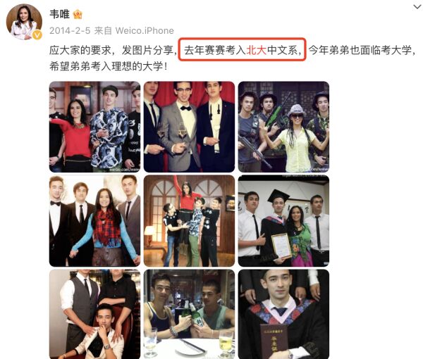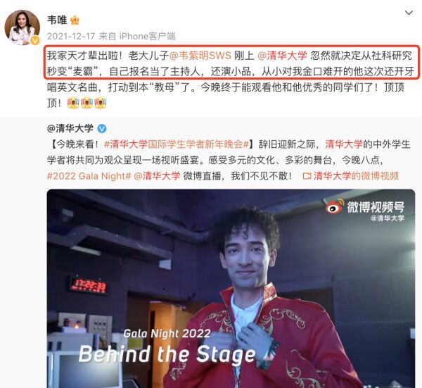 韦紫明刚进入清华大学没多久,韦唯还骄傲地发文提及过。
