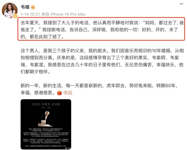 今年1月,韦唯官宣丈夫在去年夏天去世,当时,韦紫明打电话告诉妈妈“都过去了,爸爸走了”,想必韦紫明也知道妈妈那些年受过很多苦。
