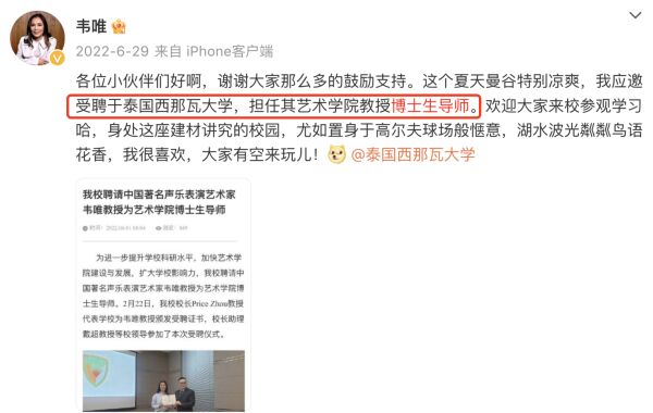 去年,韦唯还被受聘于泰国西那瓦大学,成为艺术学院教授博士生导师。可见儿子韦紫明成长得这么优秀和妈妈不无关系。