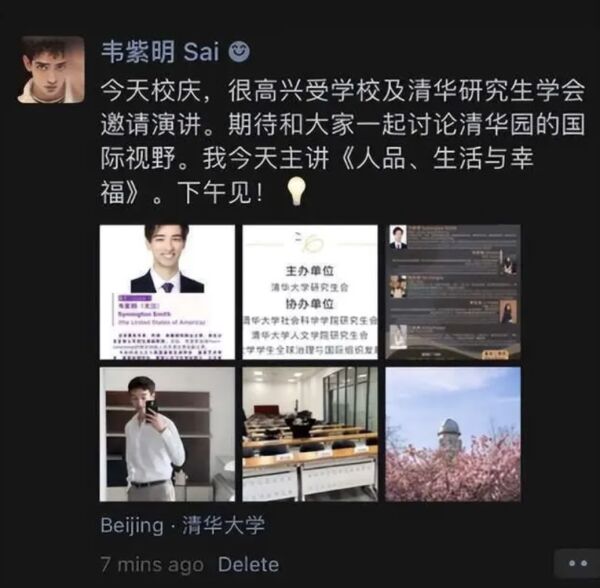 韦紫明在清华大学表现优异,曾一度受邀于学校和清华研究生学会主讲《人品、生活与幸福》。