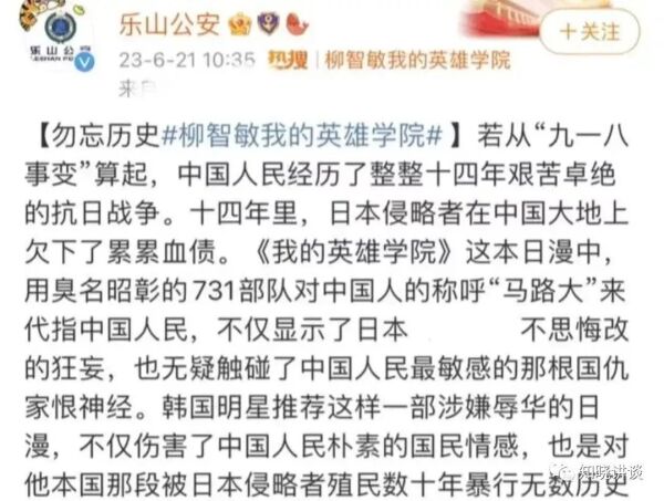 最近,韩国明星柳智敏因在社交媒体上推荐有辱华行为的日本动漫《我的英雄学院》而引起了众多中国网民的不满!