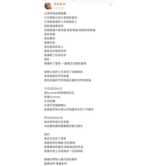 台娱再上一分!6月27日晚,歌手萧敬腾在个人社交平台发文官宣恋情,他还表示在经纪人林有慧生日前一天(6月26日)已经向对方求婚成功,双重惊喜,简直惊呆了一众网友。不得不说,老萧真的好会啊,选在林有慧生日当天官宣这个好消息,真的给足了对方安全感和爱意。恭喜老萧!