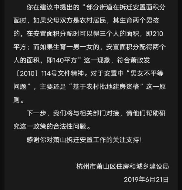网友反映,萧山区住房和城乡建设局曾回复区人大代表建议,“这一现象,符合萧政发【2010】114号文件精神。对于安置中 ‘男女不平等问题’,主要还是‘基于农村批地建房资格’这一原则”。