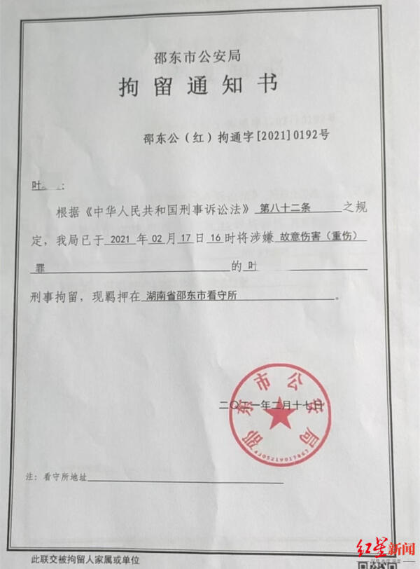 6月26日,叶先生告诉红星新闻记者,2021年2月,还在读高三的小叶在家中用刀砍伤了自己的弟弟,弟弟送去医院抢救后医院报了警,2月17日小叶因涉嫌故意伤害罪被刑事拘留于邵东市看守所。
