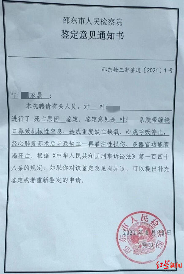 近日, 湖南省邵东市的叶先生在网络报料称,其19岁的儿子小叶于2021年在邵东市看守所内死亡,死亡原因为胶带缠绕口鼻致机械性窒息,造成重度缺血缺氧、心跳呼吸停止,经心肺复苏术后导致缺血-再灌注性损伤、多器官功能衰竭死亡。