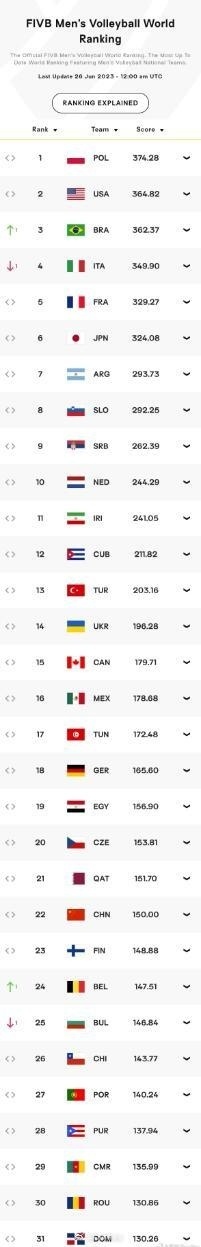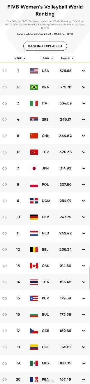 女排方面:波兰女排来到第八,德国女排进入前十,多米尼加来到第九位,中国女排第五,土耳其女排第六。