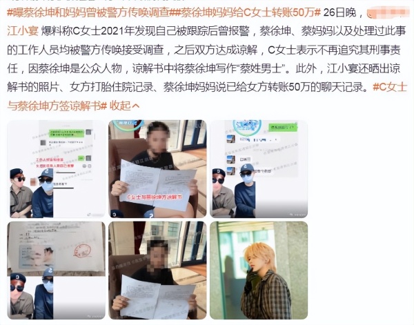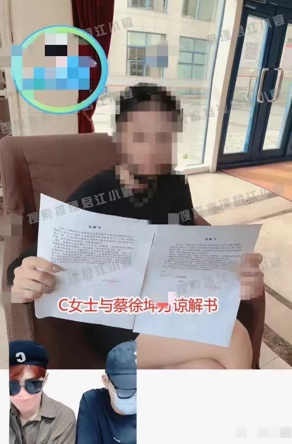 从曝光的截图来看,C女士手持谅解书,双方均有签字盖章,放大图片细看,可以清晰的看到谅解书中将蔡徐坤写作“蔡姓男士”。