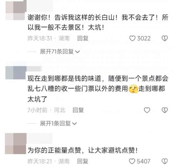 在该视频评论区,不少围观的网友表示:“谢谢你告诉我这样的长白山,我不会去了”“果断放弃去长白山避暑的打算”;不过也有人留言表示质疑,“毫无证据的几句话,毁了大家对长白山的印象,我真不理解博主遇到了什么”……