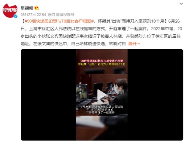 26日,上海市徐汇区人民法院以在线庭审的方式,开庭审理了一起案件。2022年中旬,20岁出头的小伙张文宾因快递配送事宜结识了被害人林晓,并获悉对方位于徐汇区的居住地址。在张文宾的供述中,自己给林晓送快递,林晓对自己都很热情,张文宾认为两人当时是暧昧关系,且两人之间发生了实质关系,张文宾表示这些都早于林晓和丈夫陈杰(化名)谈恋爱之前。