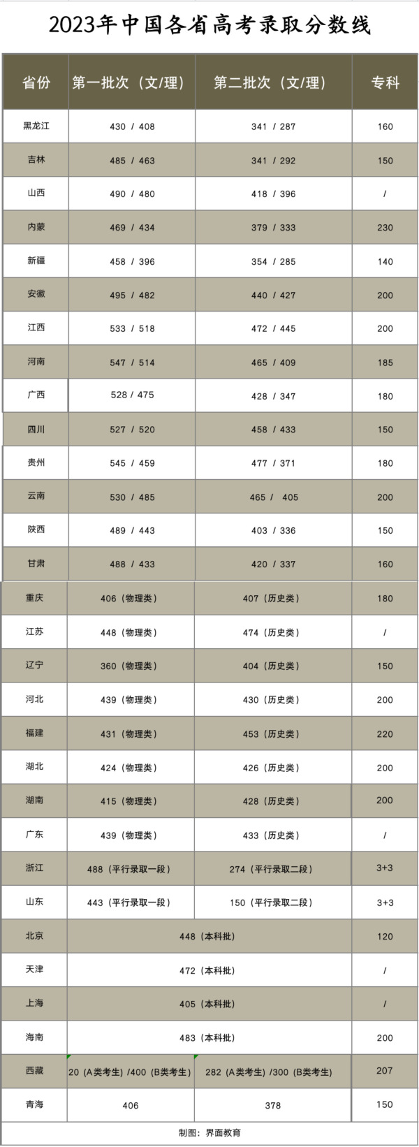 2023年各省本科录取分数线。制图:界面新闻 陈振芳