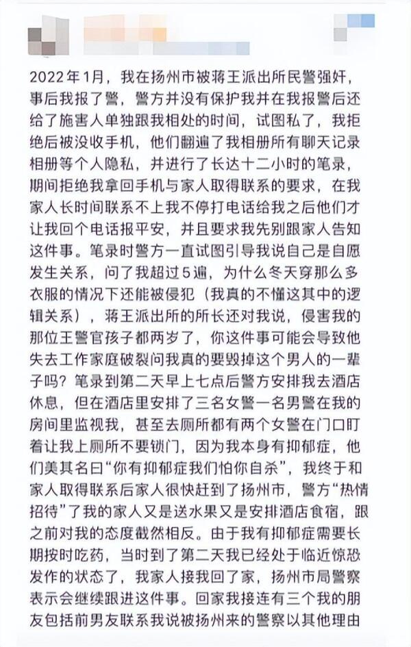 导读:6月27日,有网友发文称2022年1月被扬州市蒋王派出所一民警强奸,且在报警后,该民警未受到任何处理。目前扬州市公安局和市纪委监委正在介入调查。