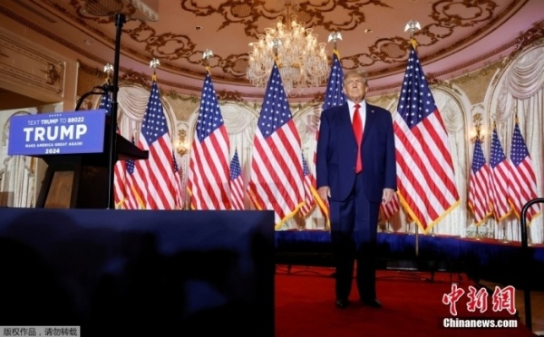 当地时间2022年11月15日,美国前总统特朗普在佛罗里达州海湖庄园发表演讲,正式宣布将参加2024年美国总统大选。
