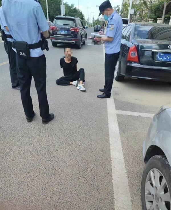 极目新闻记者获取的一张现场抓捕图片显示,嫌疑人背着双手坐在地上,其后方不远处停着一辆黑色SUV,一名女子倒在车前,有民警正在现场处理。